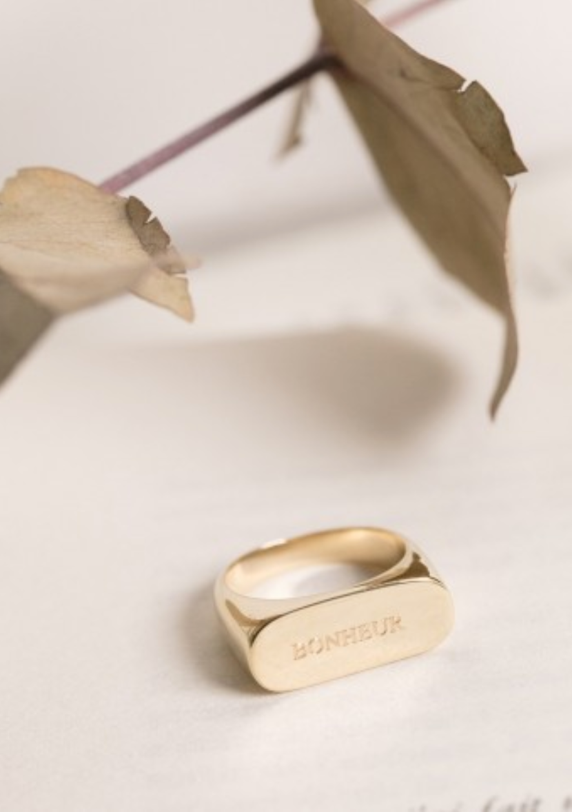Cette chevalière rectangulaire en plaqué or, déjà gravée d’un message, allie élégance et originalité. Son design épuré et sa forme géométrique apportent une touche de raffinement intemporel. Parfaite pour marquer un moment spécial ou sublimer votre style quotidien, cette pièce personnalisée ajoute une note unique à votre allure.