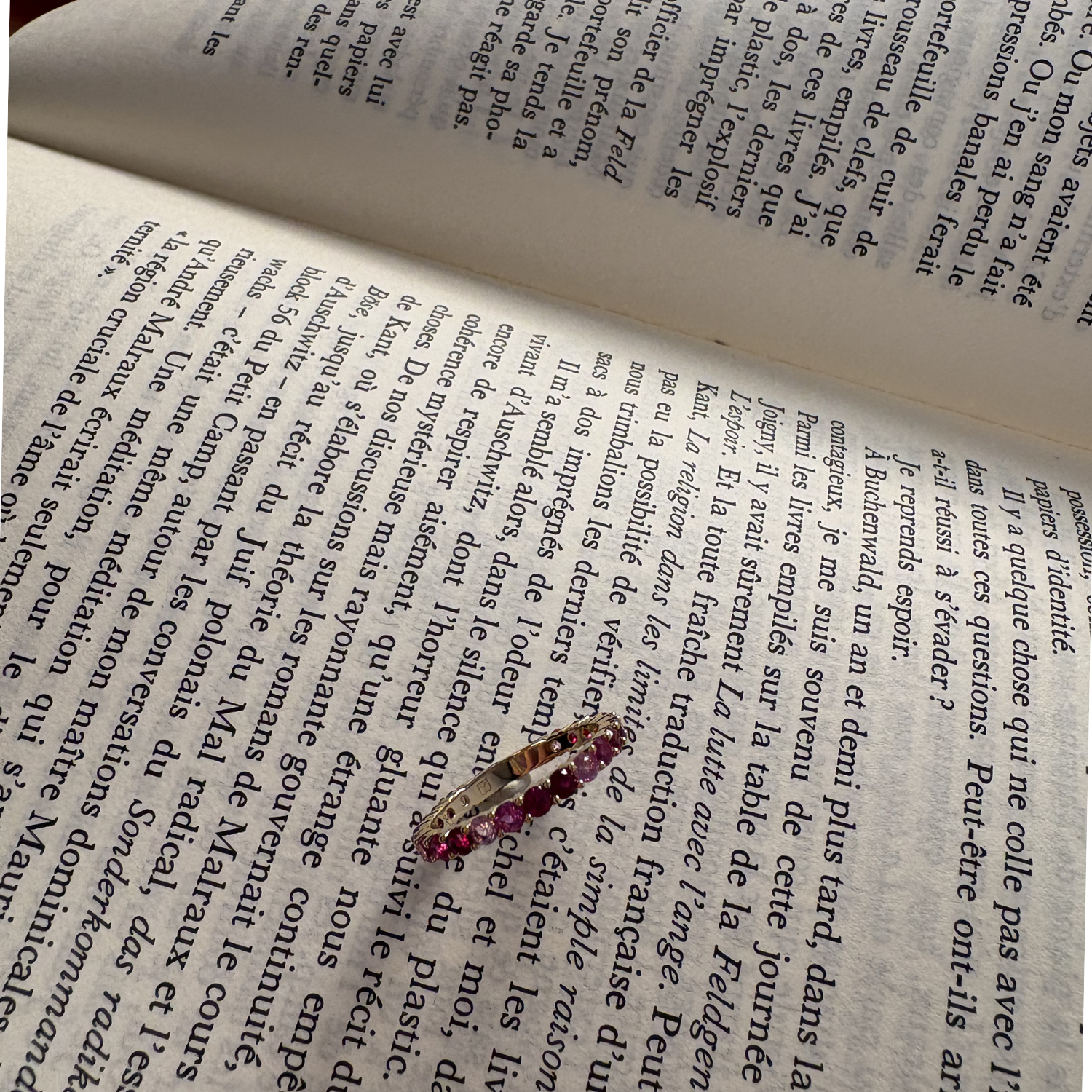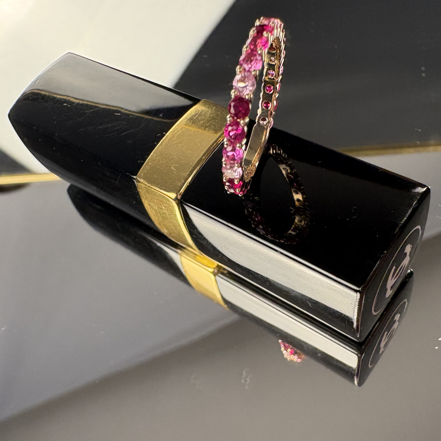 La bague Régal est une alliance sertie de zircons teintés dans différentes nuances de rose, délicatement incrustée, crée un jeu de lumière captivant qui met en valeur chaque mouvement de la main.