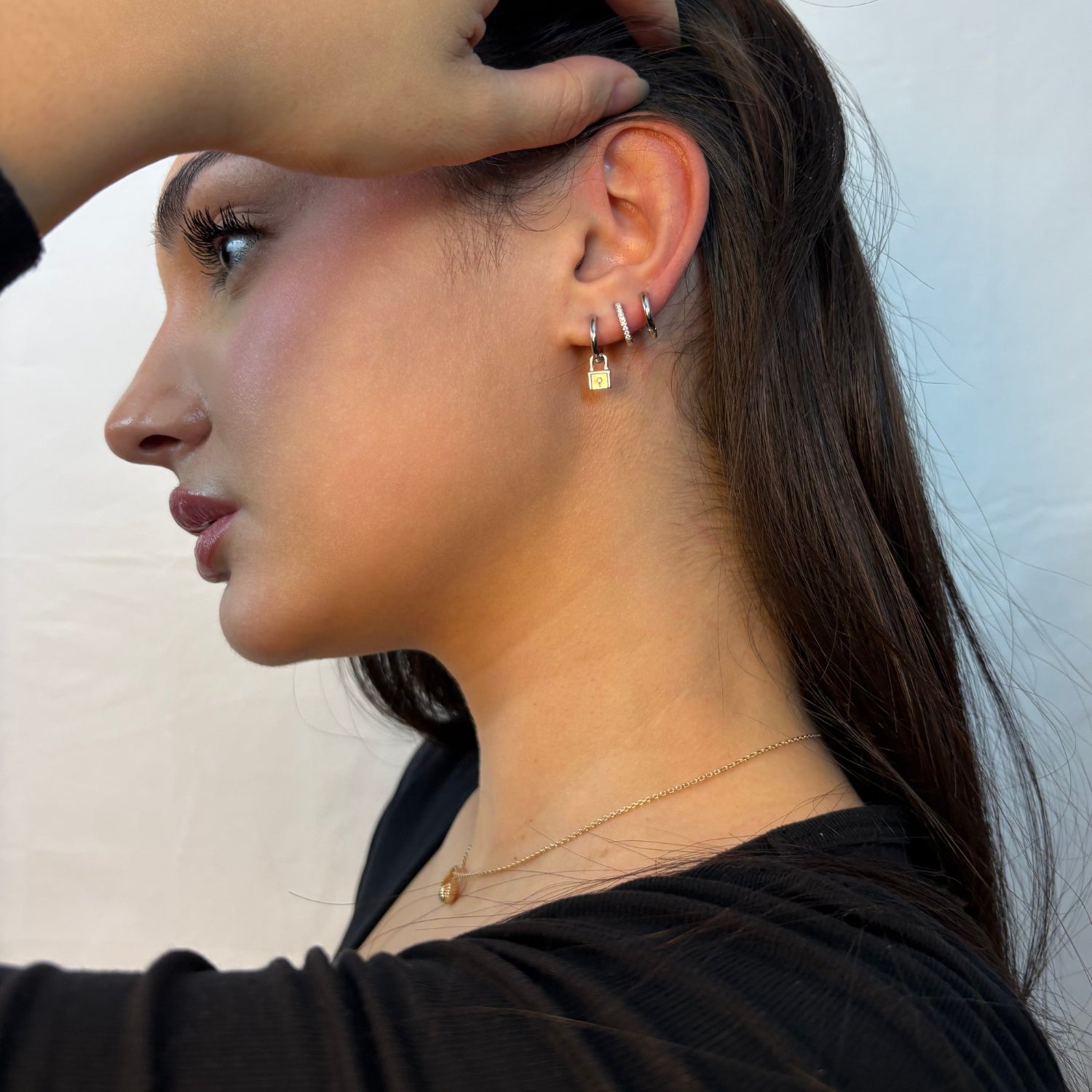 Le Charm Mini Cadenas en plaqué or brille à chaque mouvement. Discret avec ses 5 mm, il est orné d’un zircon blanc qui apporte une touche de lumière. Un bijou élégant et minimaliste pour sublimer vos boucles d’oreilles au quotidien.