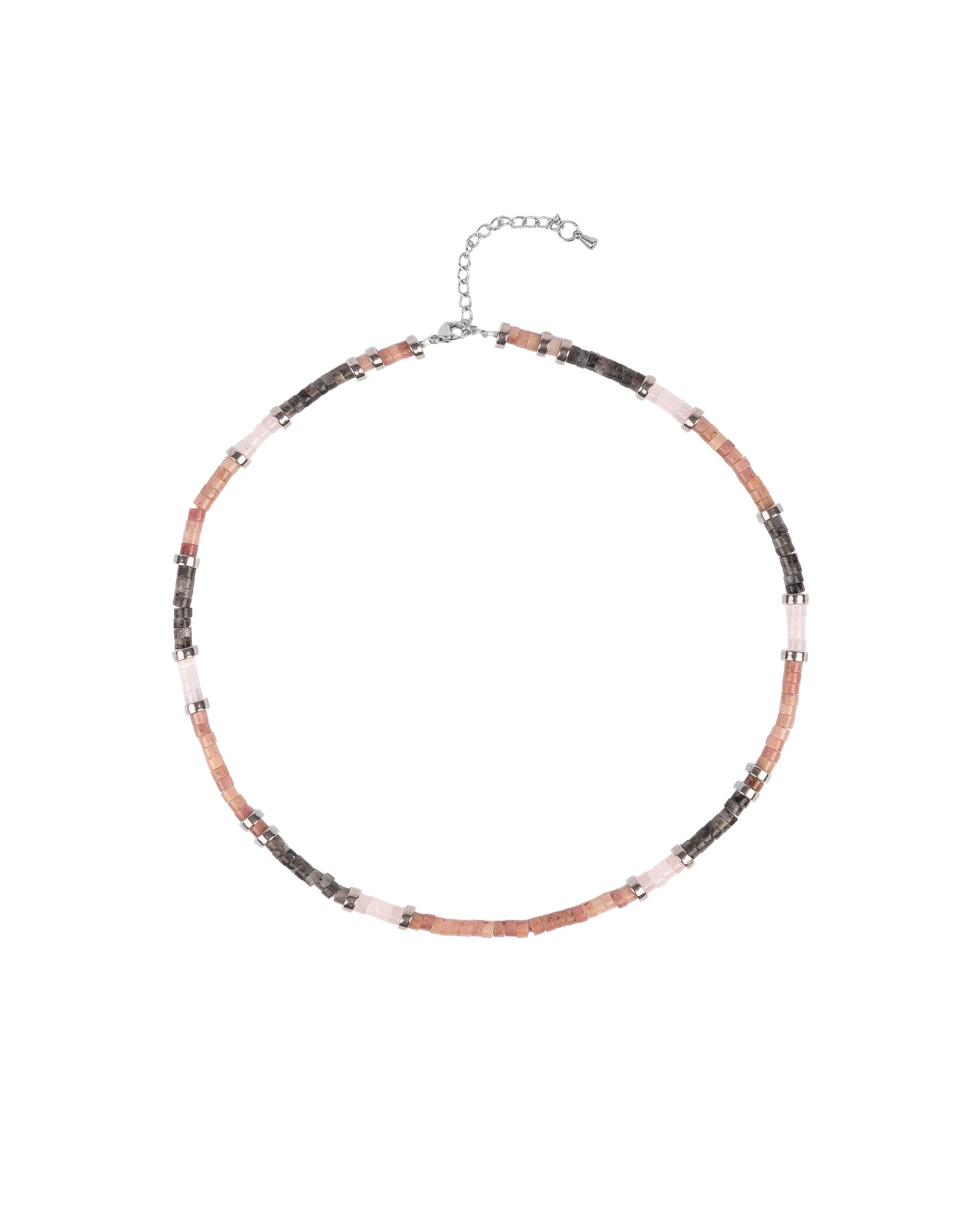 Il associe trois pierres naturelles, la nacre, la labradorite et la rhodonite, qui capturent la lumière chaude du coucher de soleil, la fraîcheur mystique de l’océan et la douceur naturelle des plages de Malibu.
