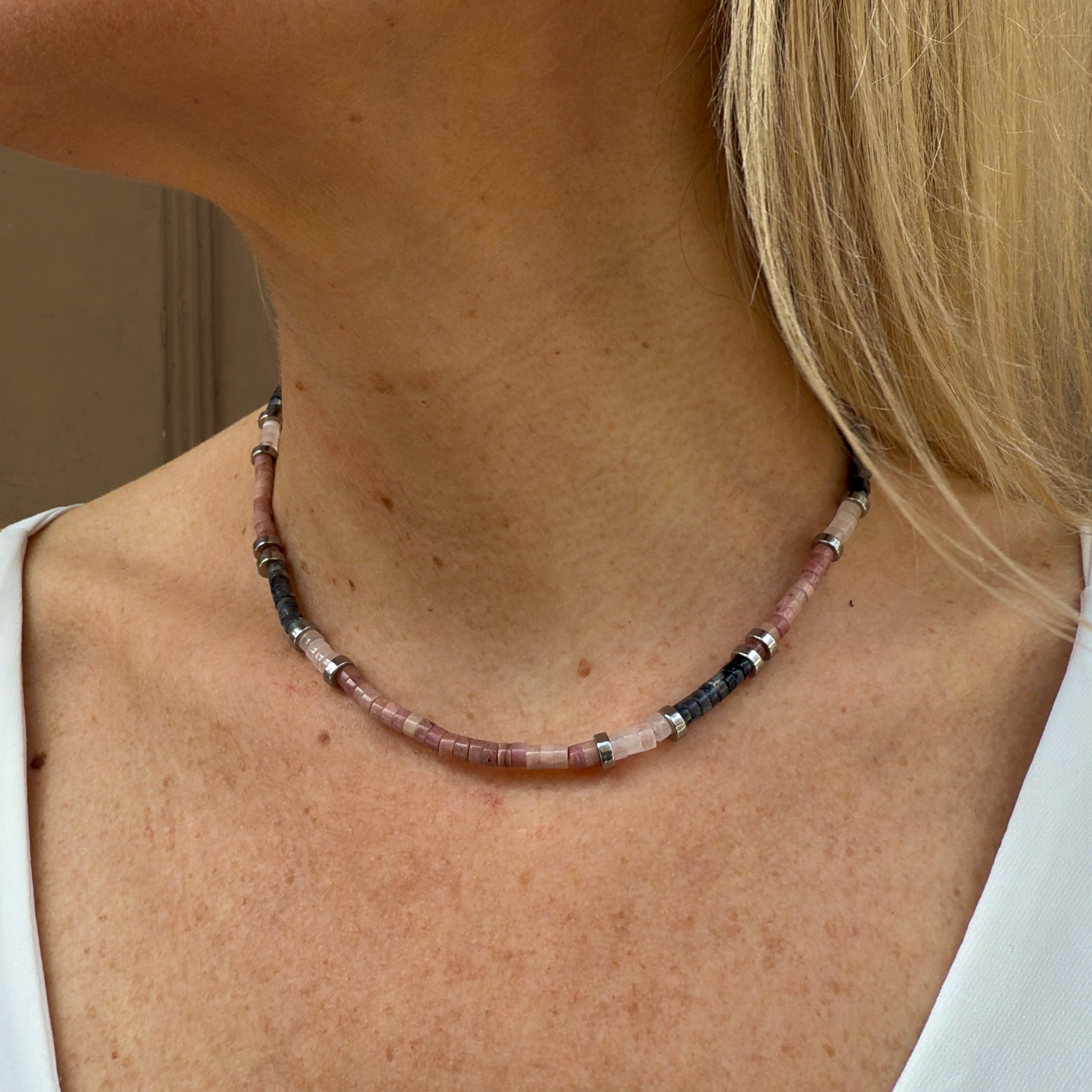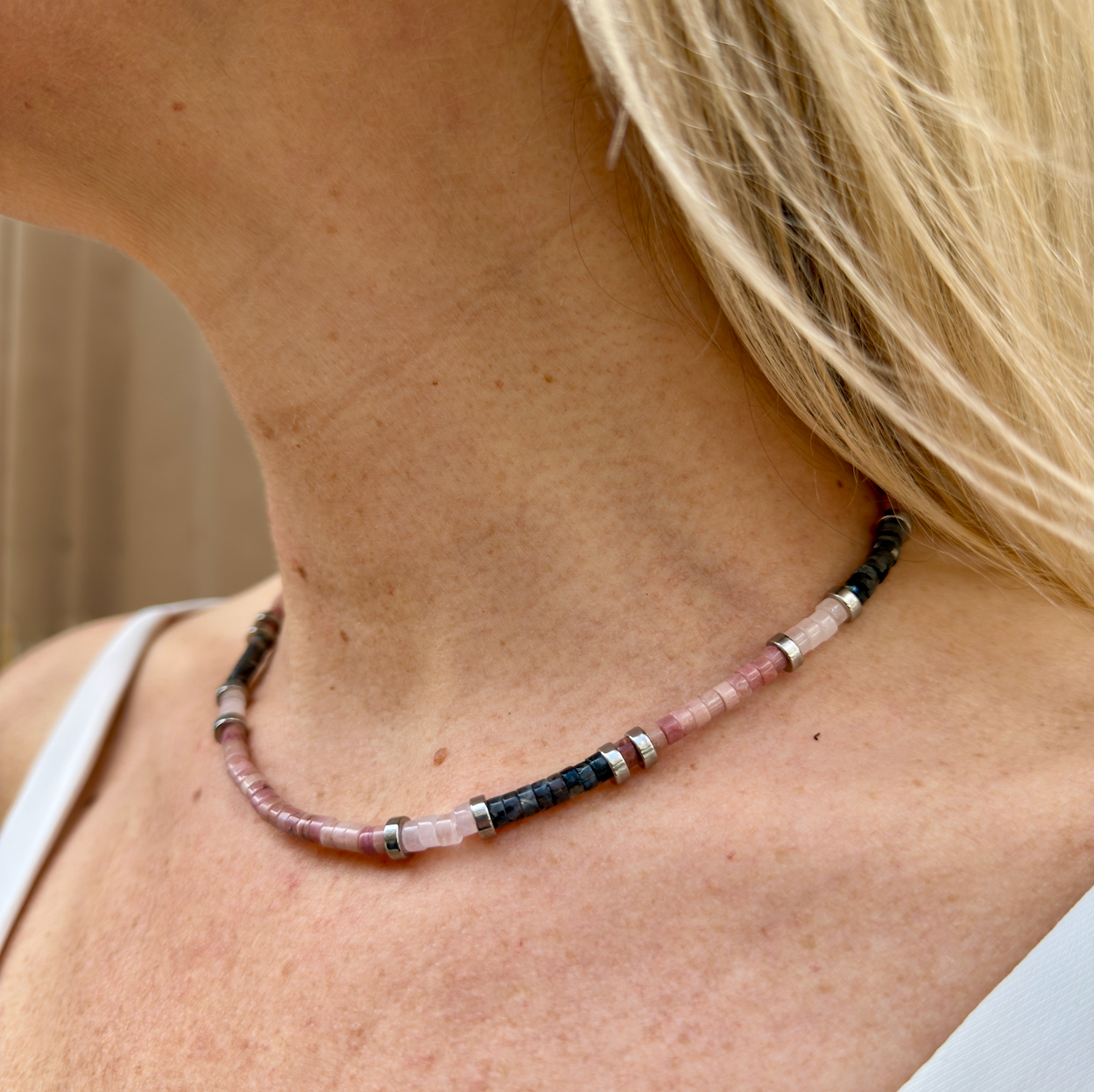 Malibu est bien plus qu’un simple collier : c’est une célébration de la dualité, de l’élégance affirmée et de la force intérieure. Inspiré par les contrastes saisissants entre ciel et mer, entre douceur et intensité, il marie la tendresse du rose, la profondeur du noir et l’éclat argenté dans une composition moderne et magnétique.