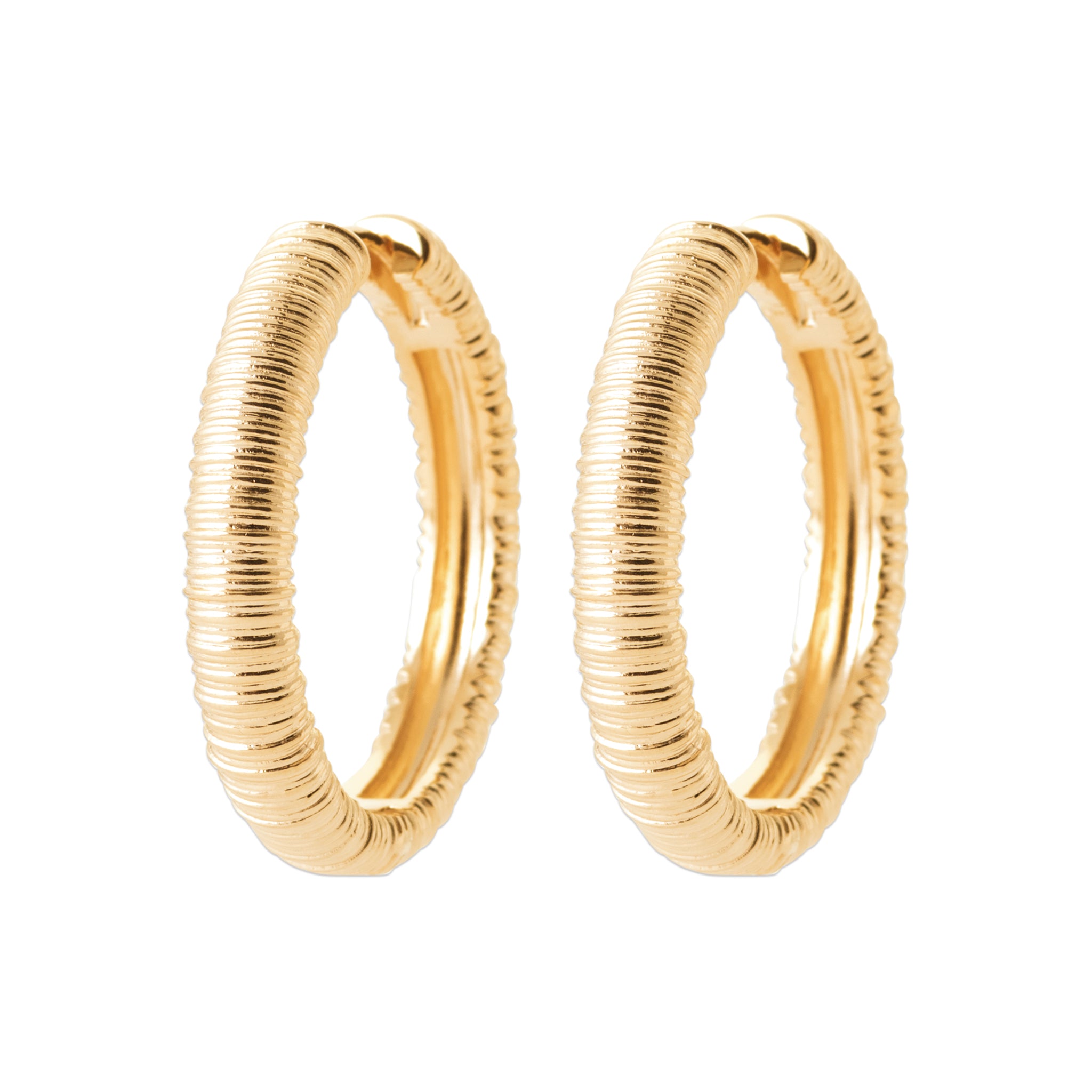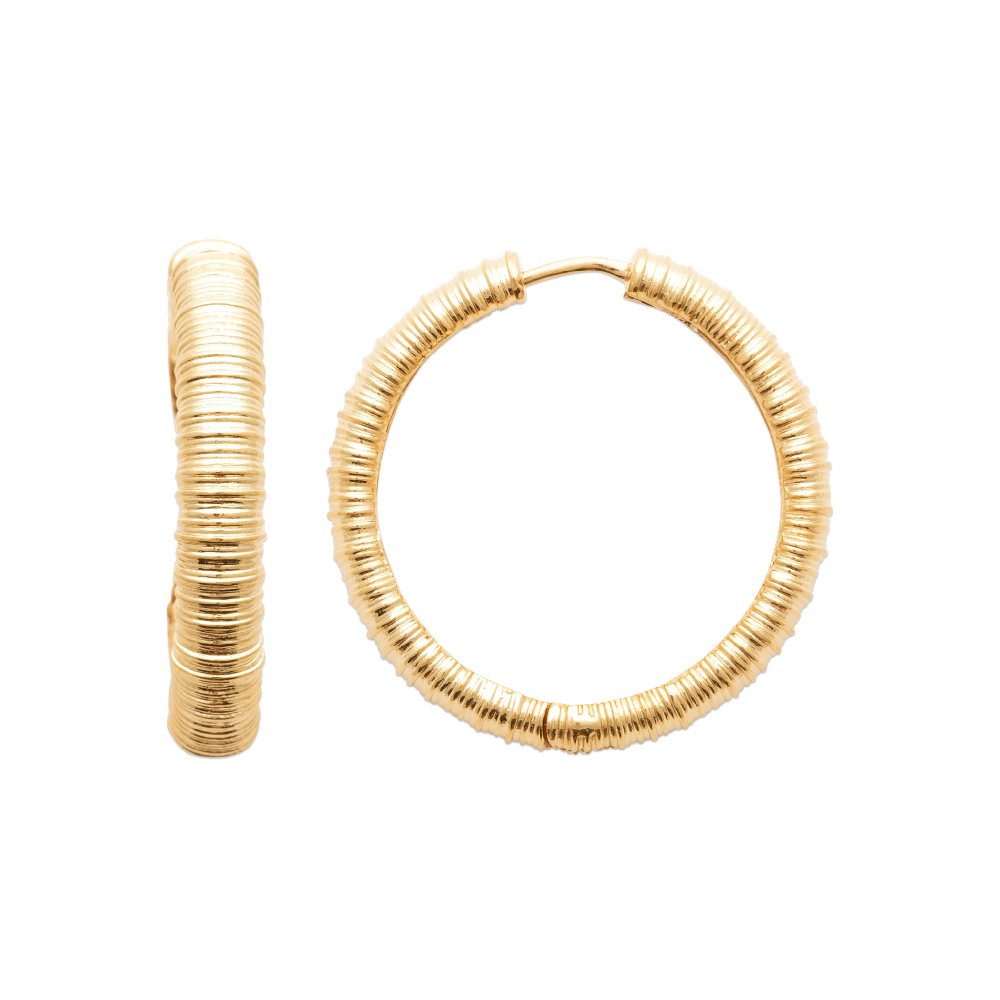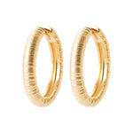 Les créoles Eva se distinguent par leur texture unique et leur allure contemporaine. Leur surface finement striée apporte du relief et capte délicatement la lumière, pour un rendu à la fois moderne et élégant.